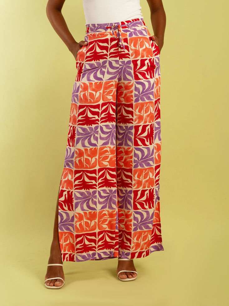 Com modelagem ampla e cintura com elástico, a calça oferece praticidade e liberdade de movimento, garantindo conforto ao longo do dia. Os bolsos laterais adicionam funcionalidade e um toque casual ao design. A estampa Azulejo, com seus padrões sofisticados e atemporais, traz um ar exclusivo e elegante à peça.